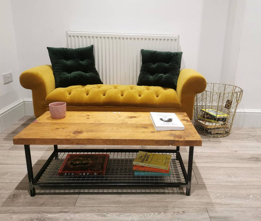 Industrial Raw Steel and Reclaimed Scaffold Board Coffee Table with Mesh Shelf